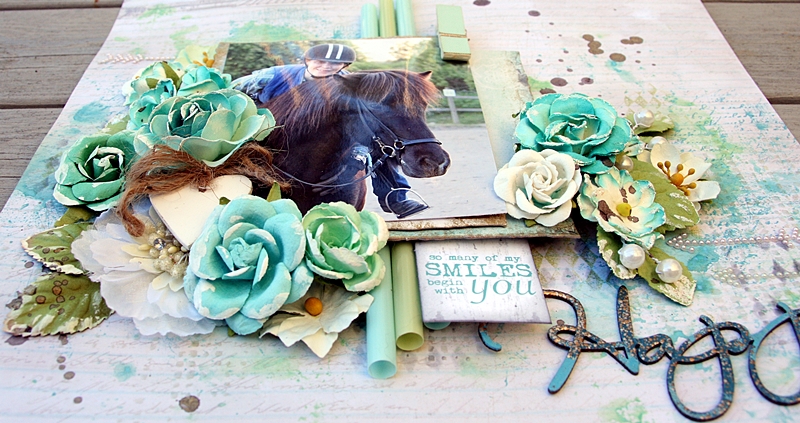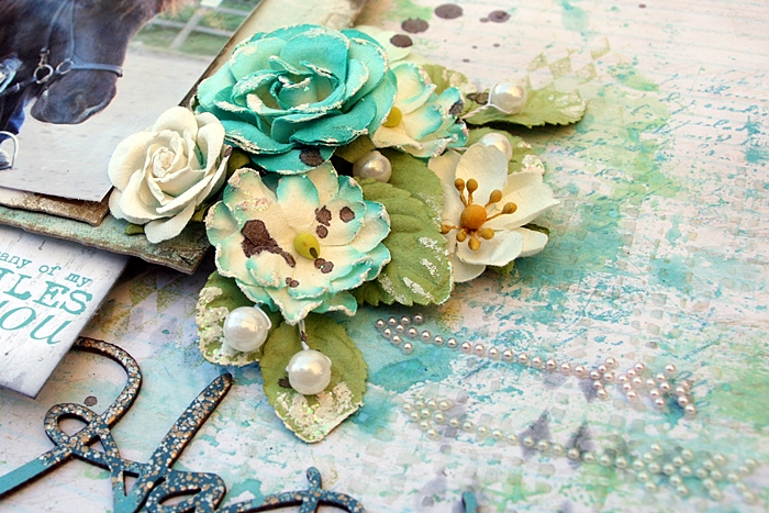 On this layout I´ve used some inks, gesso, modelling paste, spray colors, stamps, stencils and of course lots of Prima flowers.